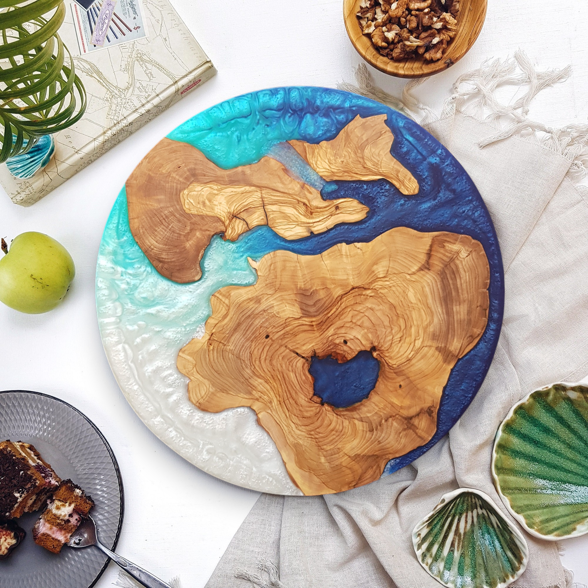 Azure Shore – Handmade Olive Wood & Epoxy Resin Round Serving Board