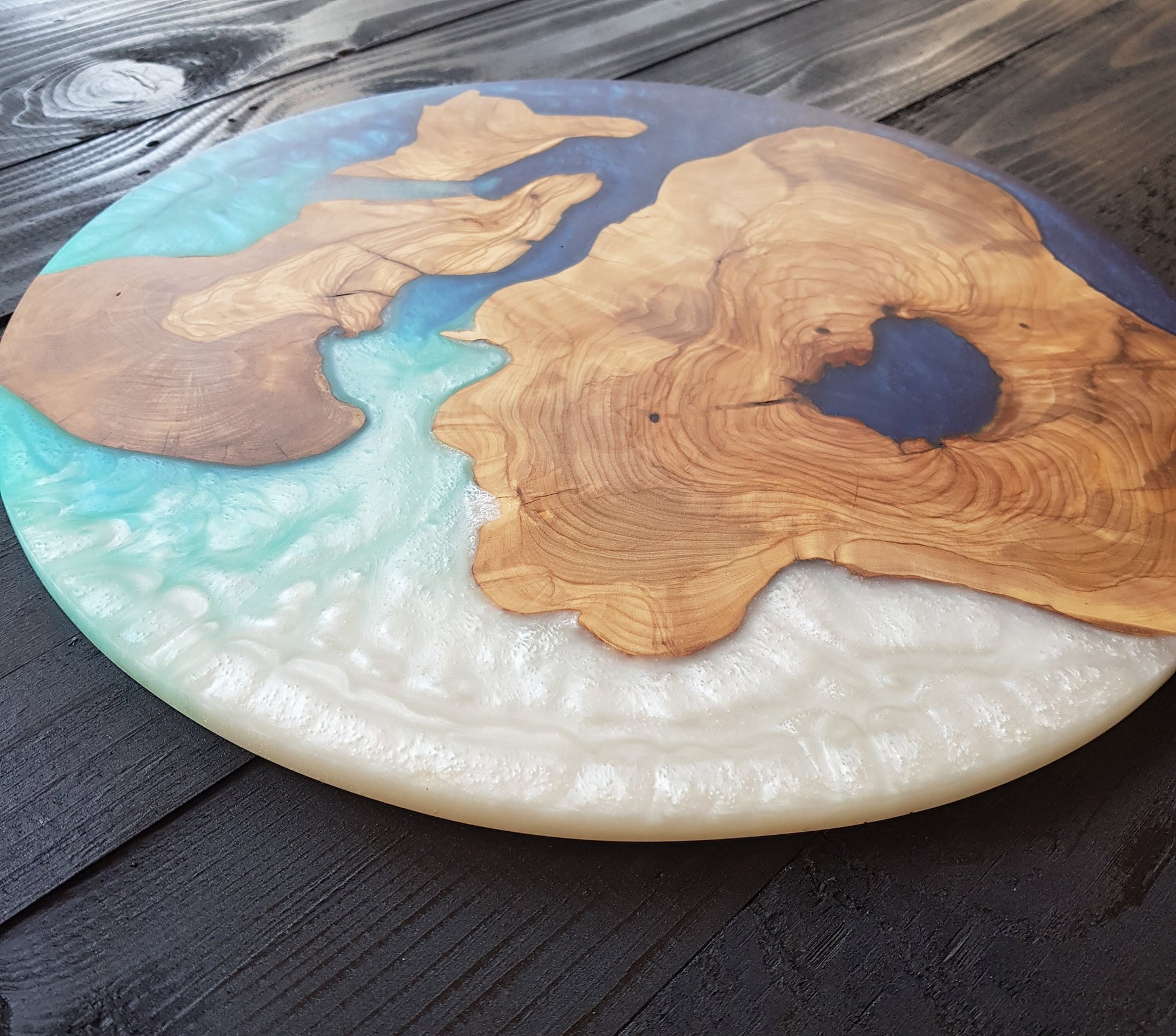 Azure Coast – Round Olive Wood & Ocean Blue Epoxy Serving Board
